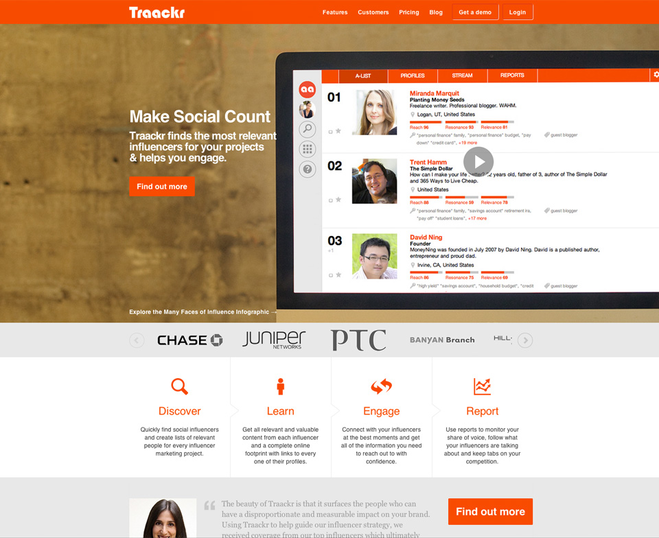 We joined forces with Traackr to custom develop a WordPress theme that was fully responsive and adaptive to various screen sizes. Traackr is a real-time listening and built-in engagement system that makes it easy to interact with the people who are most prominent for your business sector.